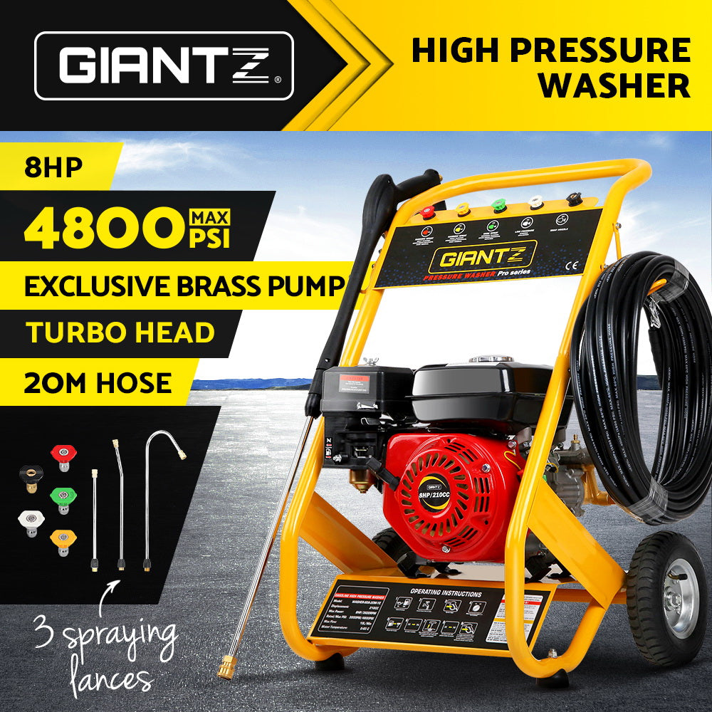 Powerful jets of water for a cleaning experience like no other. The GIANTZ 8hp Pro-series High Pressure Washer makes light work cleaning cars, walls, boats, decks, footpaths, pavements or any other surface of tough dirt and grime in unrivalled performance.
