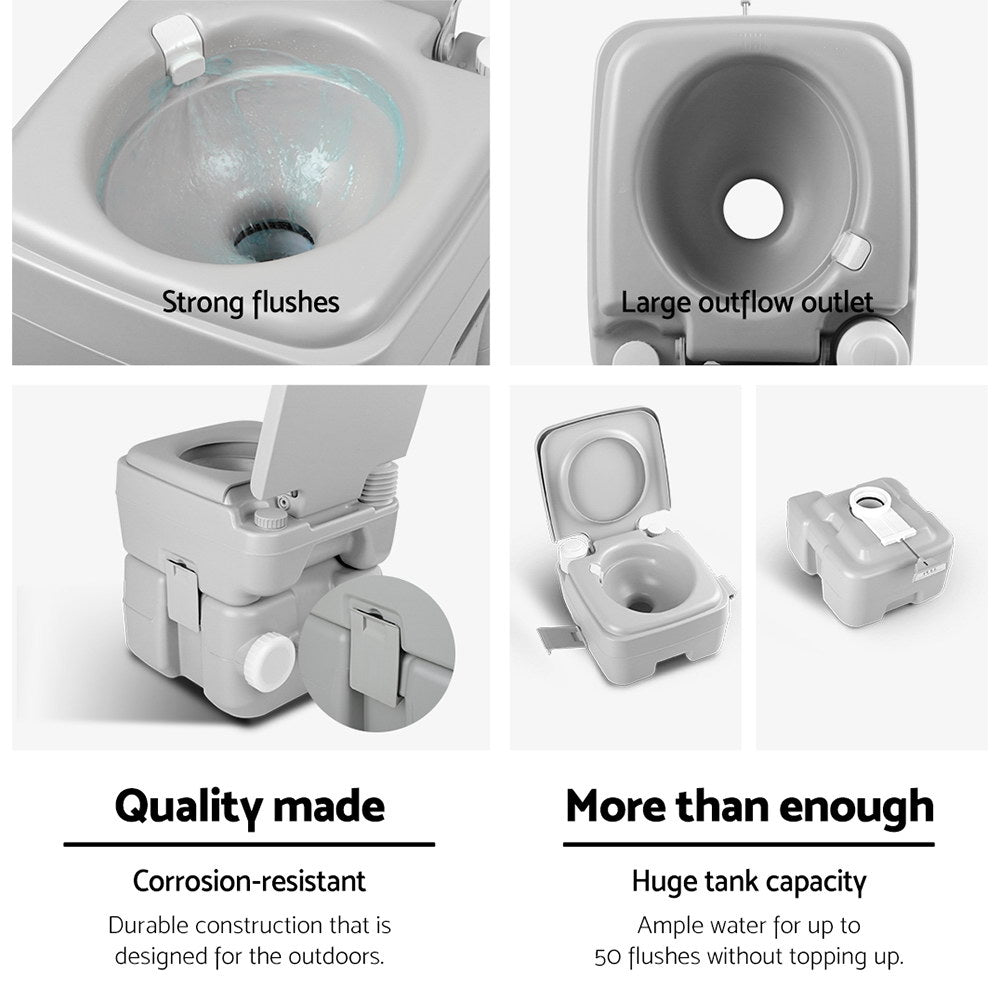 With 12L of freshwater capacity, it provides about 50 flushes without recirculating. Making sure your camping experience stays comfortable during the whole time! While the tent is designed with steel poles for strong structure and comes with pegs and ropes for extra stability, you don't need to worry when you're half way showering or changing in the wild!